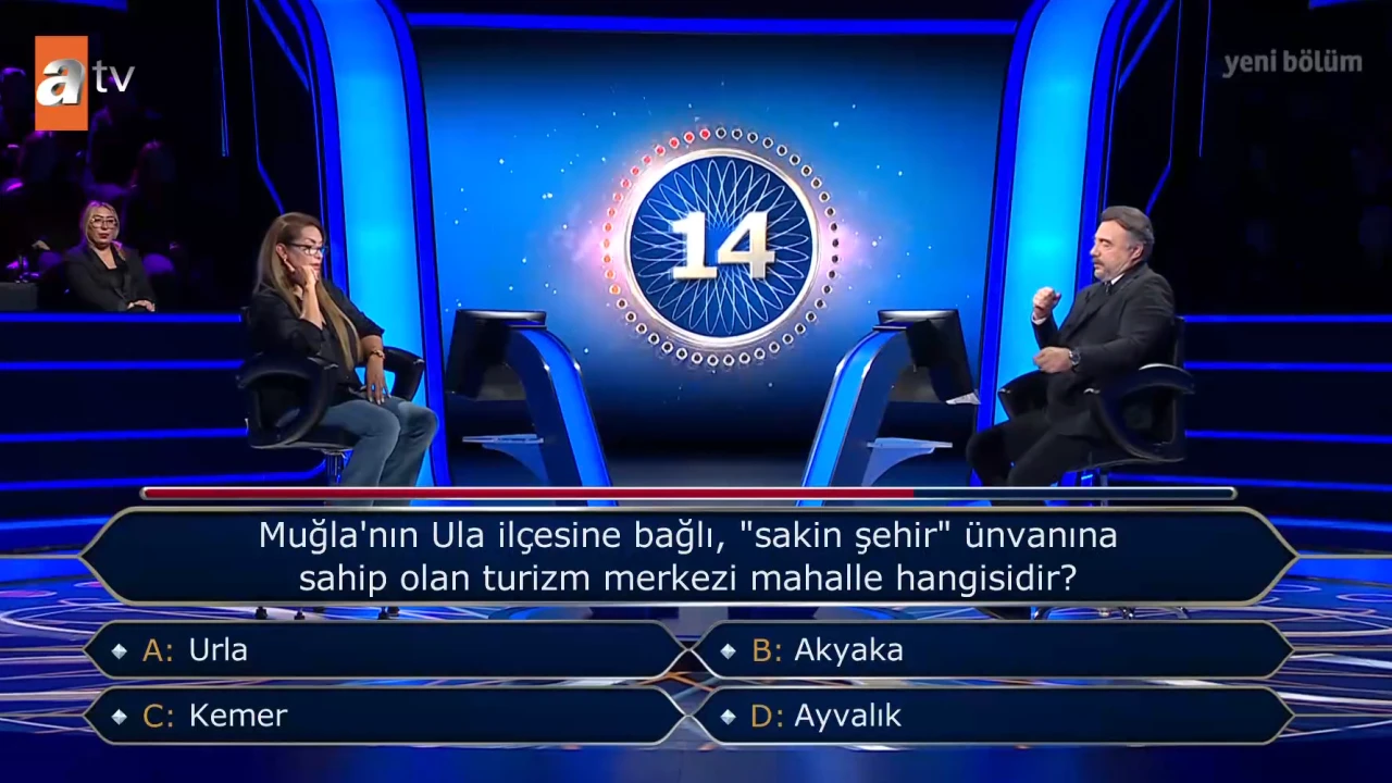 Şıklarda Urla, Akyaka, Kemer ve Ayvalık yer aldı. Yarışmacı doğru cevabı B: Akyaka olarak verdi. Böylece Cittaslow (sakin şehir) unvanına sahip olan Akyaka’nın doğal ve kültürel değeri
