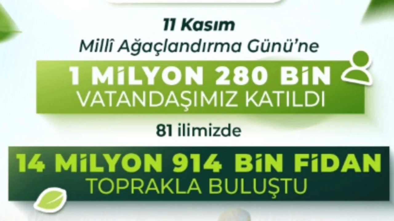 Orman Genel Müdürlüğü tarafından yürütülen "Yeşil Vatan Seferberliği" kapsamında, 11 Kasım Milli Ağaçlandırma Günü etkinliklerine yoğun katılım sağlandı. Kurumun paylaştığı resmi verilere göre 1.280.000 vatandaş seferberliğe katıldı ve Türkiye çapında 81 ilde 14.914.000 fidan toprakla buluşturuldu. Etkinlik, hem sembolik hem de somut çevresel katkılarıyla dikkat çekti.
