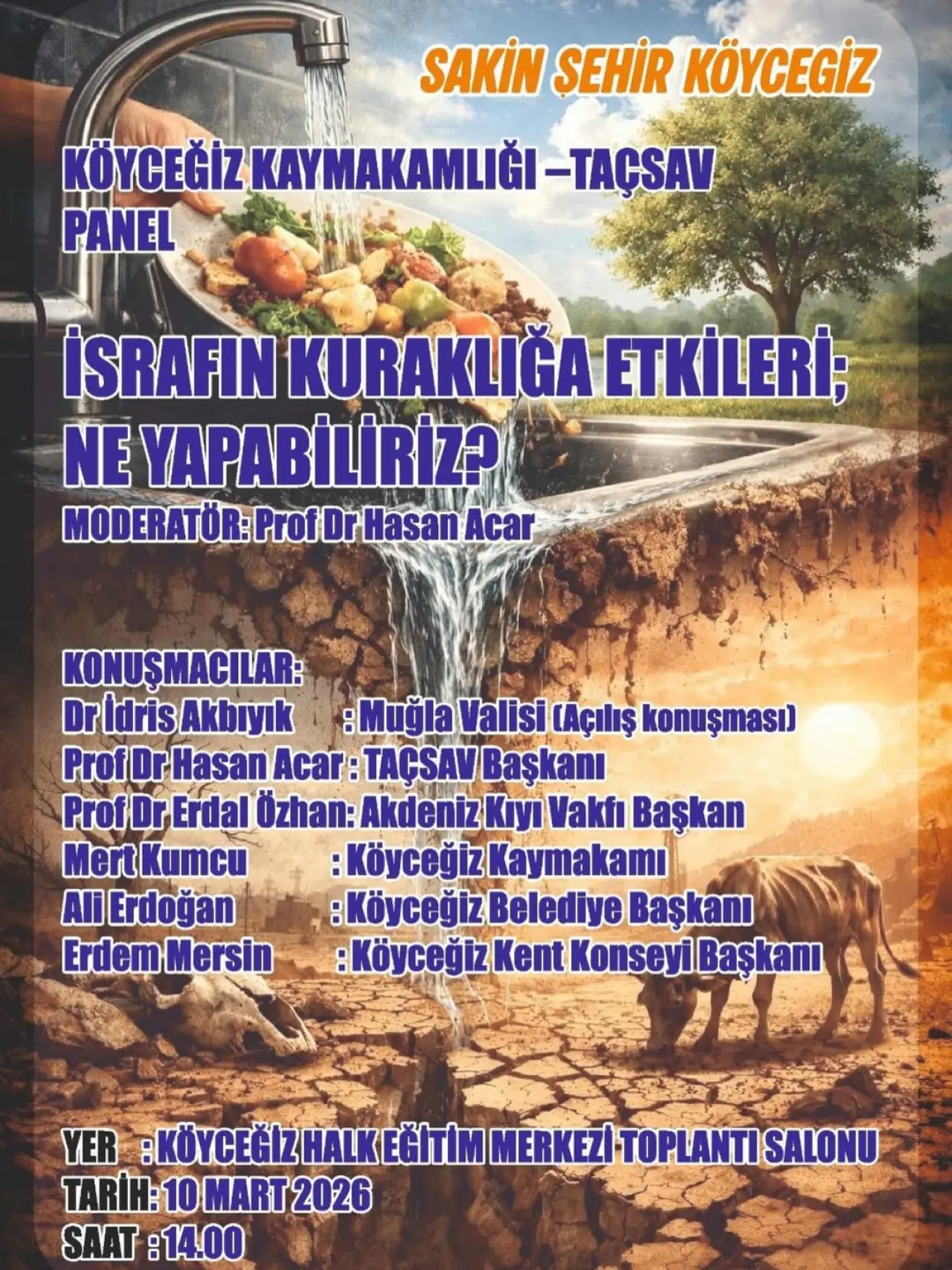 Köyceğiz Kaymakamlığı ve TAÇSAV (Türk Tarım Orman Eğitim Vakfı) iş birliğiyle, bölgenin en önemli gündem maddelerinden biri olan kuraklık ve su israfı üzerine kapsamlı bir panel düzenleniyor. "İsrafın Kuraklığa Etkileri; Ne Yapabiliriz?" başlıklı etkinlik, 10 Mart 2026 tarihinde Köyceğizli vatandaşlarla buluşacak.