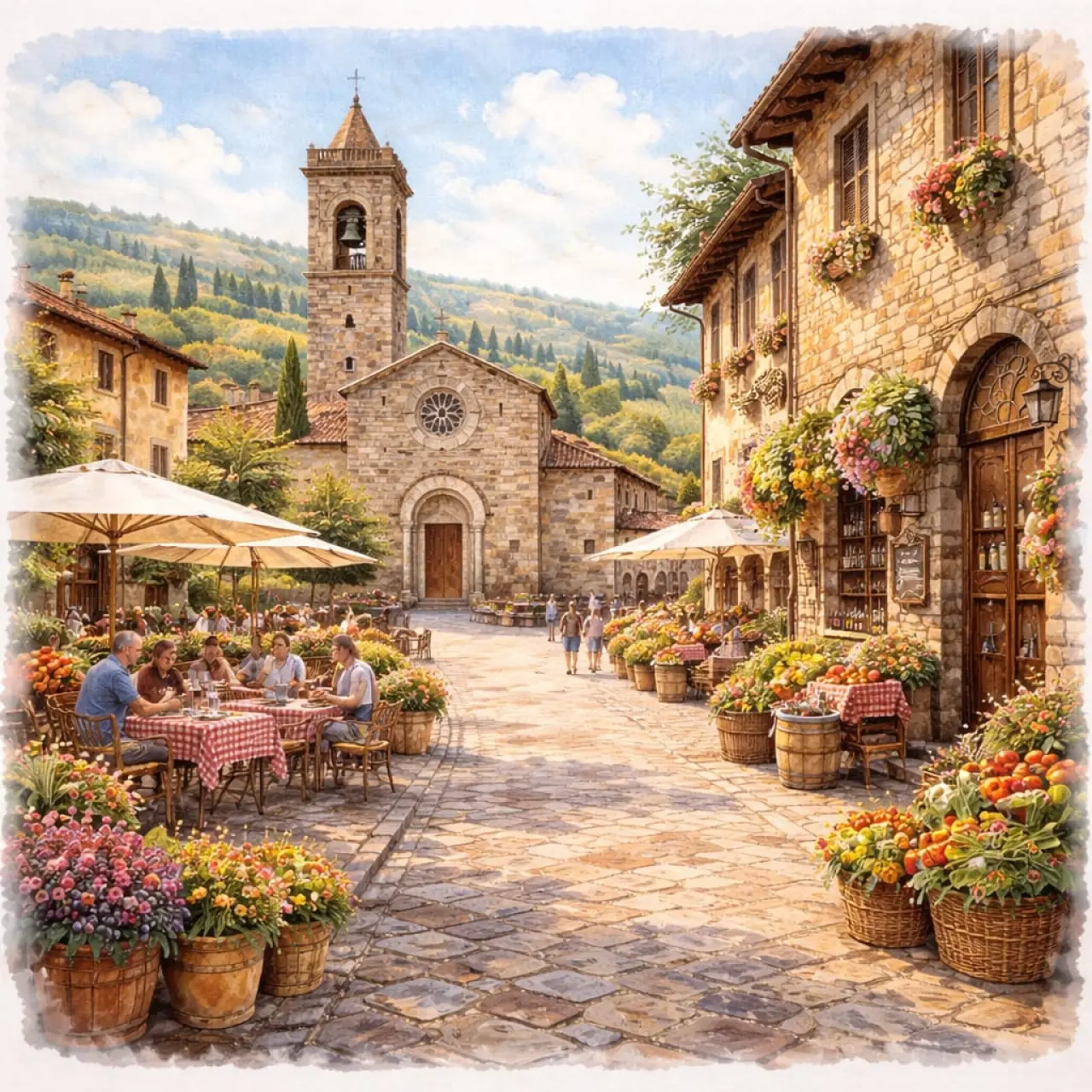 Cafélerin önünde, masalarda biriken kahkahalar, rüzgârla karışıp taş sokaklarda birer melodiye dönüşüyor. Sepetlerdeki taze ürünler, asmaların arasından sarkan salkımlar ve zeytinlerin gri-yeşil tonları, kasabanın ritmini tamamlayan renkler ve dokular hâline geliyor; adeta doğa, taşlar ve insanlar, kendi aralarında bir konser veriyor, insan sadece bir dinleyici olarak var oluyor. Ve işte tam bu noktada, Greve in Chianti yalnızca taşlardan, bağlardan ve kiremit çatılardan ibaret bir kasaba olmaktan çıkıyor; burada yavaşlık, doğayla uyum ve insan ritmi bir yaşam felsefesine dönüşüyor; yaşamın kendisi, bir şiir gibi, usulca ve derinlemesine okunuyor.