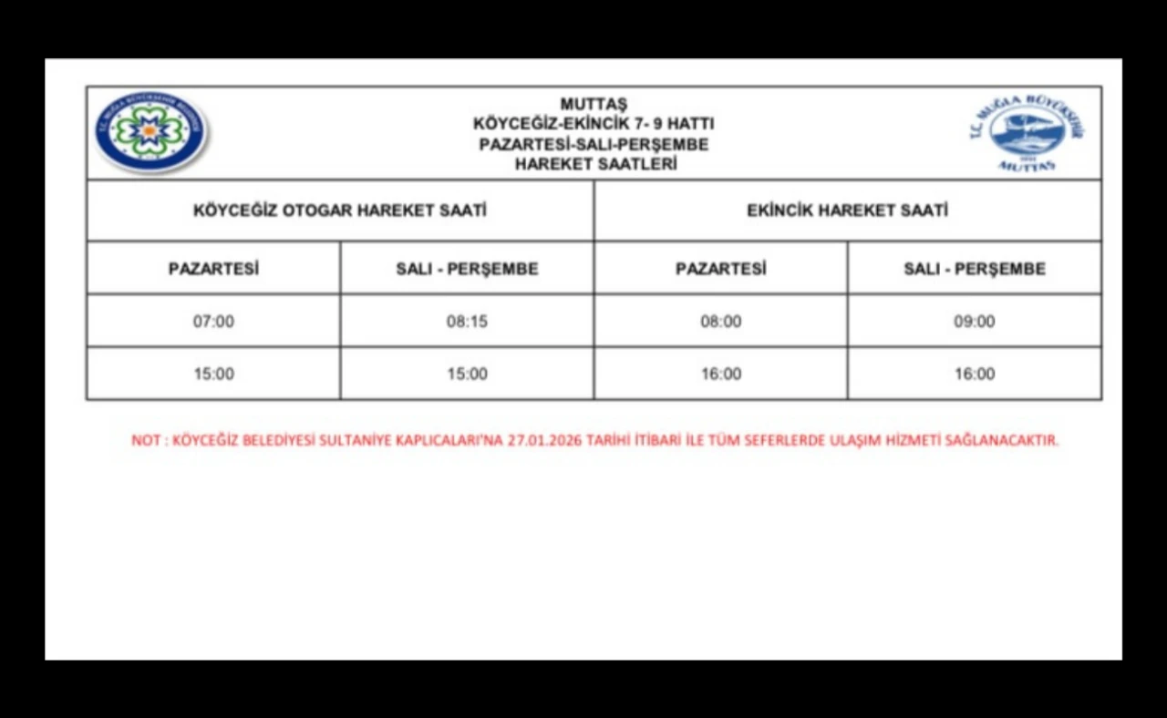 Haberin en önemli detayı ise kaplıca ziyaretçilerini sevindirdi. Köyceğiz Belediyesi Sultaniye Kaplıcaları’na, 27 Ocak 2026 tarihi itibarıyla tüm seferlerde ulaşım hizmeti sağlanacağı açıklandı. Bu sayede vatandaşlar günün her saatindeki Ekincik seferiyle kaplıcalara rahatlıkla ulaşabilecek.