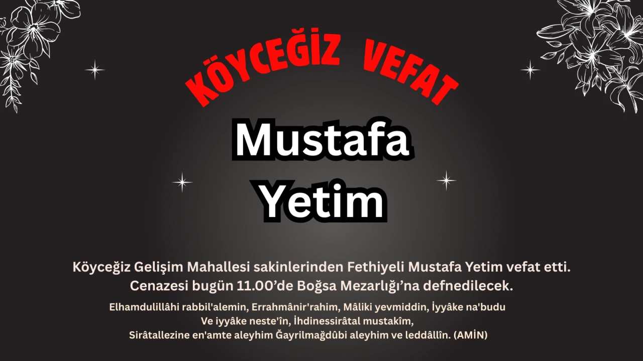 Köyceğiz Gelişim Mahallesi sakinlerinden, aslen Fethiyeli olan ve ilçemizde geniş bir kesim tarafından tanınan Mustafa Yetim’in vefat haberi büyük bir üzüntüyle karşılandı. Bir süredir Gelişim Mahallesi’nde ikamet eden ve çevresinde beyefendiliğiyle bilinen Yetim’in vefatı, ailesi ve komşuları başta olmak üzere tüm Köyceğiz halkını yasa boğdu.