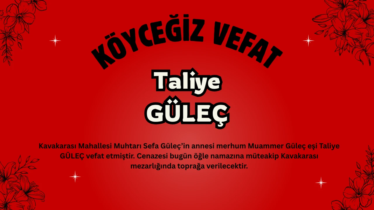 Köyceğiz Kavakarası Mahallesi Muhtarı Sefa Güleç’in annesi, merhum Muammer Güleç’in eşi Taliye Güleç vefat etti. Aile yakınları ve mahalle sakinleri, Güleç ailesinin acısını paylaşmak üzere cenaze törenine katılacak.