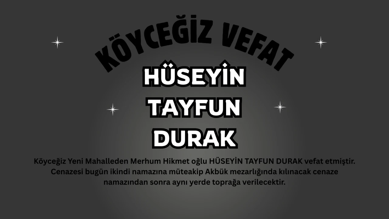 Köyceğiz Yeni Mahalle’den merhum Hikmet oğlu Hüseyin Tayfun Durak hayatını kaybetti. Ailesi ve yakınlarını yasa boğan vefat haberi ilçede büyük üzüntüye neden oldu.