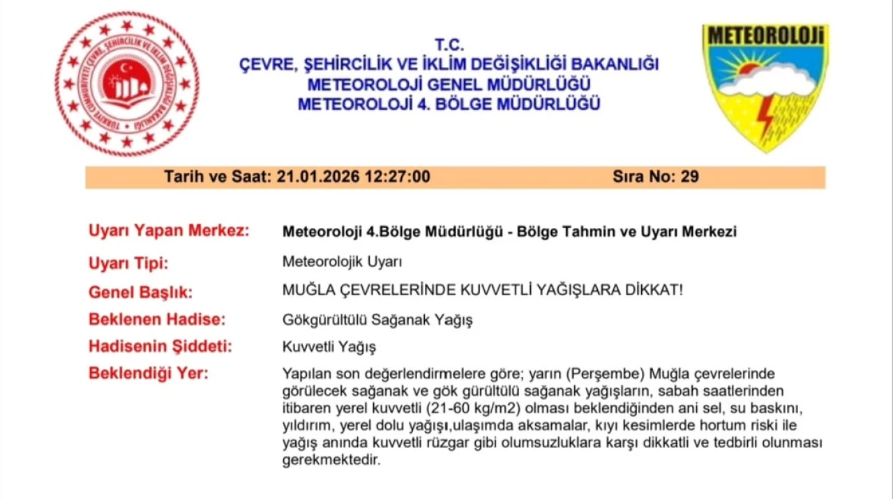 Meteoroloji Genel Müdürlüğü’nün 21 Ocak 2026 tarihli resmi uyarısına göre, Muğla çevresinde ve özellikle Köyceğiz ilçesinde 22 Ocak Perşembe 10:0023:004. Bölge Tahmin ve Uyarı Merkezi tarafından yayımlandı.