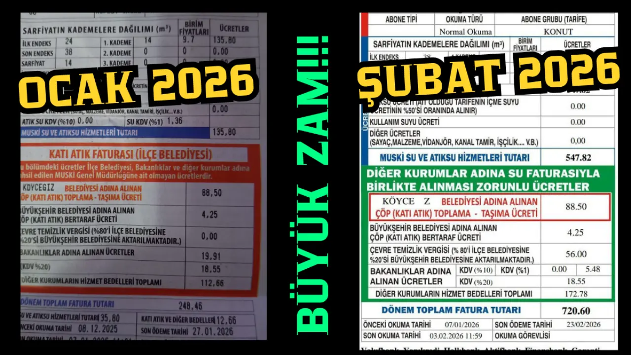 Köyceğizli abonelerin faturasındaki tek sürpriz su birim fiyatı değil. Ocak ayı faturasında sıfır olarak görünen Çevre Temizlik Vergisi kaleminin Şubat faturasında 56 TL olarak yansıtılması dikkat çekti. Diğer kurumlar adına tahsil edilen bedellerin toplamı da bir ay içinde 112 TL’den 172 TL’ye yükseldi. Vatandaşlar, "Aynı musluğu açtık, aynı miktarda su kullandık ama ödediğimiz bedel nasıl olur da 248 TL'den 720 TL'ye çıkar?" diyerek tepkilerini dile getiriyor.